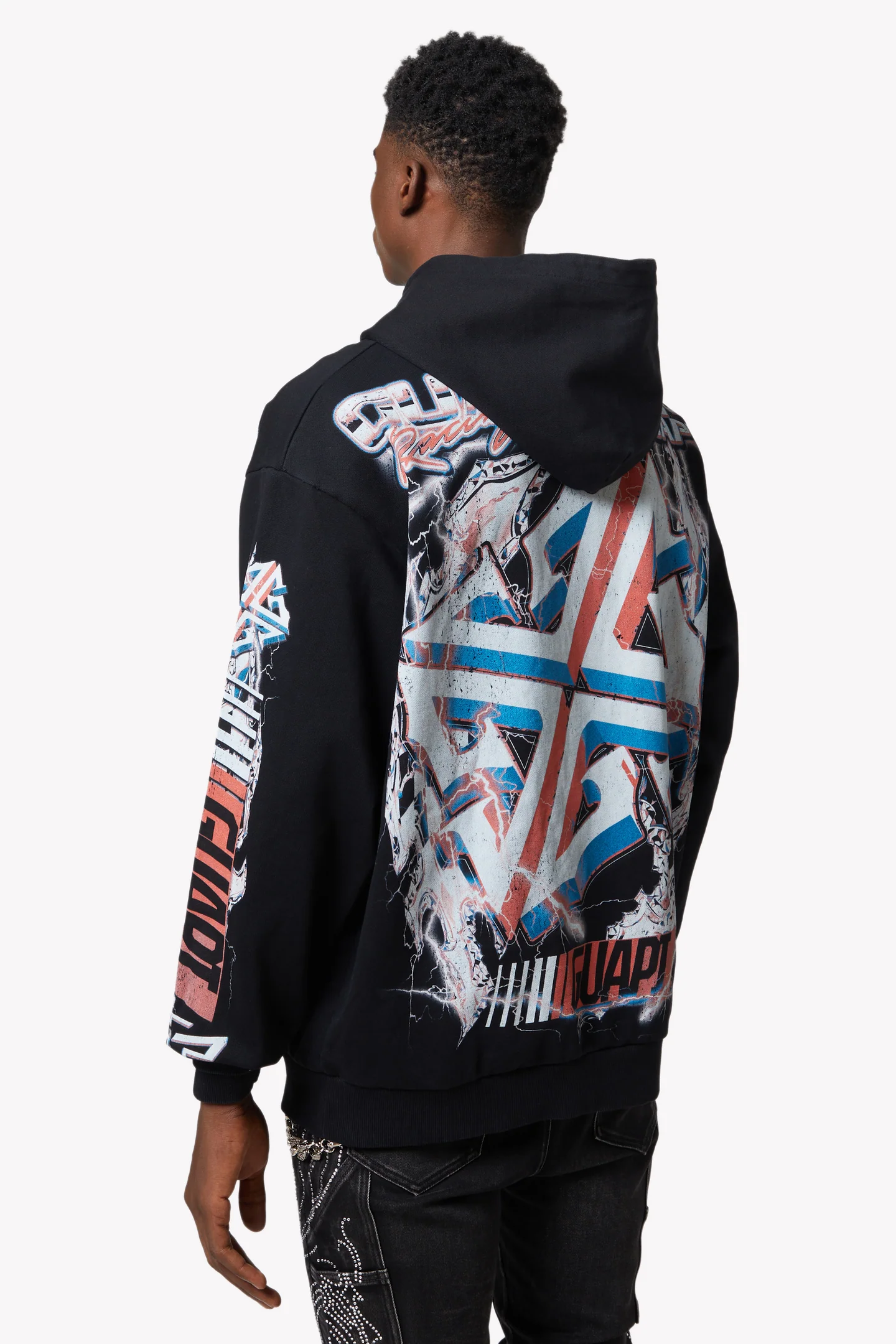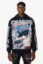 Crafted from premium heavyweight cotton, the hoodie features a bold all-over print of lightning-charged racecars drifting through smoke and chaos, rendered in vivid red, blue, and white hues. The front displays a large āGUAPI Racingā logo across the chest, accented with silver metal stud embellishments for an added edge. Engineered details like graphic sleeves and the oversized GUAPI monogram on the back give the piece a 360-degree presence.