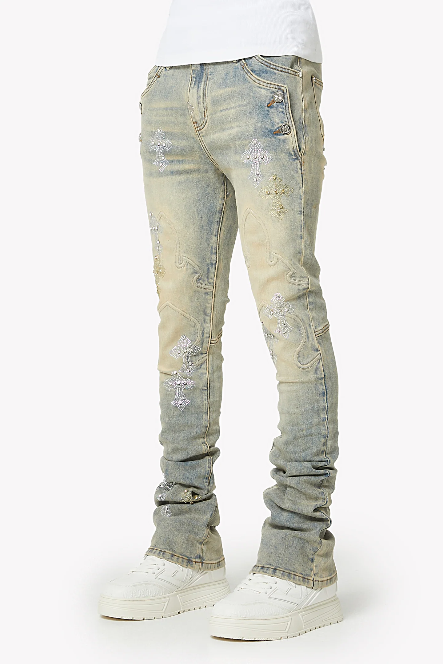 A signature GUAPI silhouette reimagined in a washed-out, sun-bleached finish. The Faded Cross Denim V2 blends vintage tones with sculpted panel work and fully embellished crystal cross motifs. The denim features soft sand-beige fading through the front thigh area, creating a natural gradient into the cooler blue tones along the legs. Stacked ankles give the fit its classic GUAPI drape, while the embroidered cross contours add depth and shape to the overall structure of the jeans. Multi-tone crystal placements of silver and gold bring a full-body shimmer effect, giving the denim a strong statement presence from every angle.
