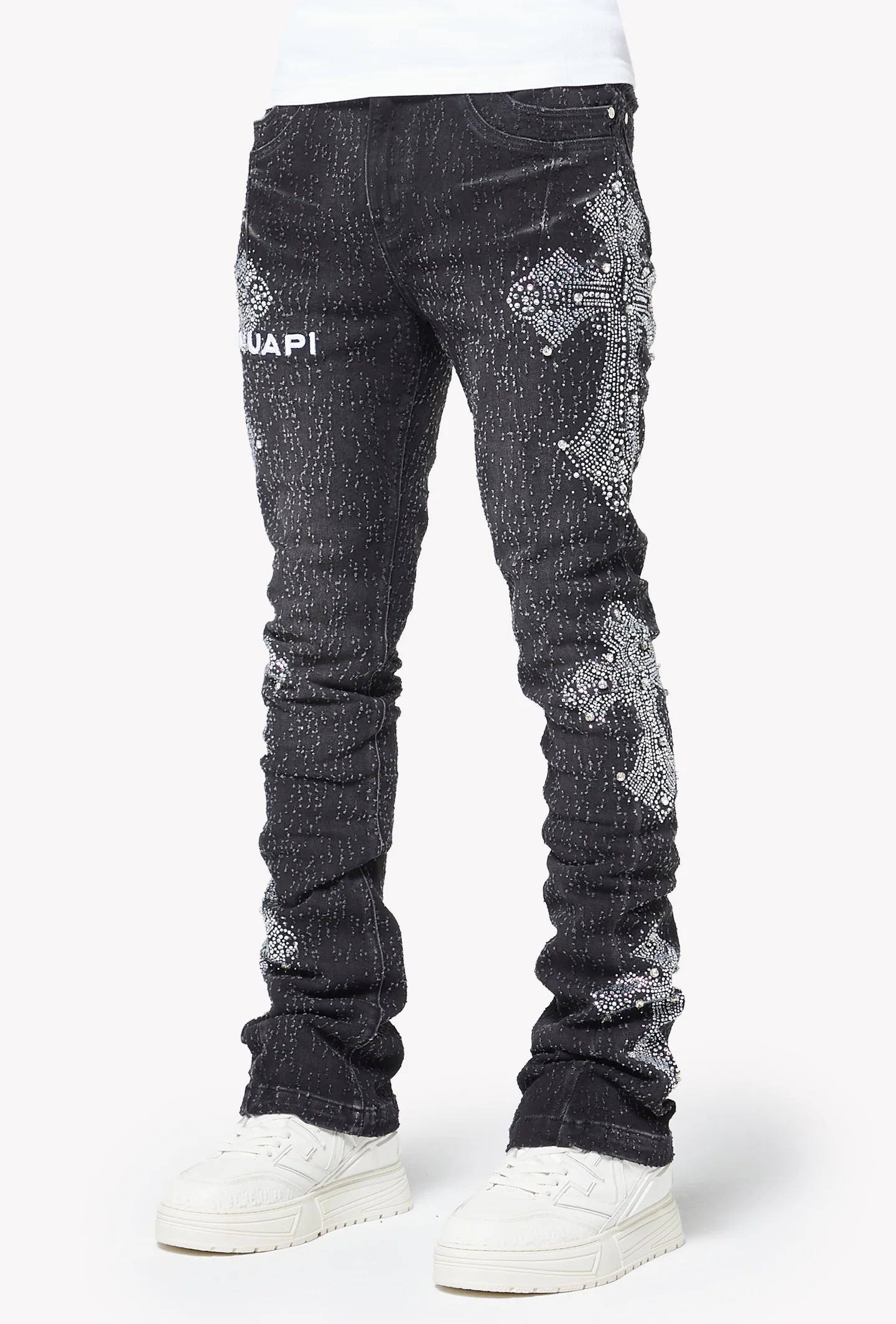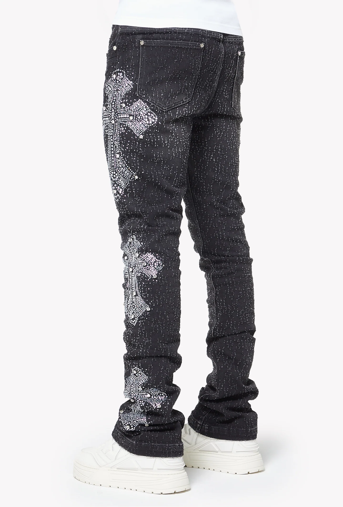 A bold statement piece built for spotlight moments, these Vintage Black Distressed Cross Denim pants merge rugged texture with luxury embellishment. Crafted in a deep washed-black tone, the denim is covered with a rainfall-style distressed pattern that adds movement and depth across the entire silhouette. The signature highlight is the oversized crystal-studded cross motifs placed along the thighs, knees, and lower legs, each formation built from hundreds of precision-set stones that catch light from every angle.