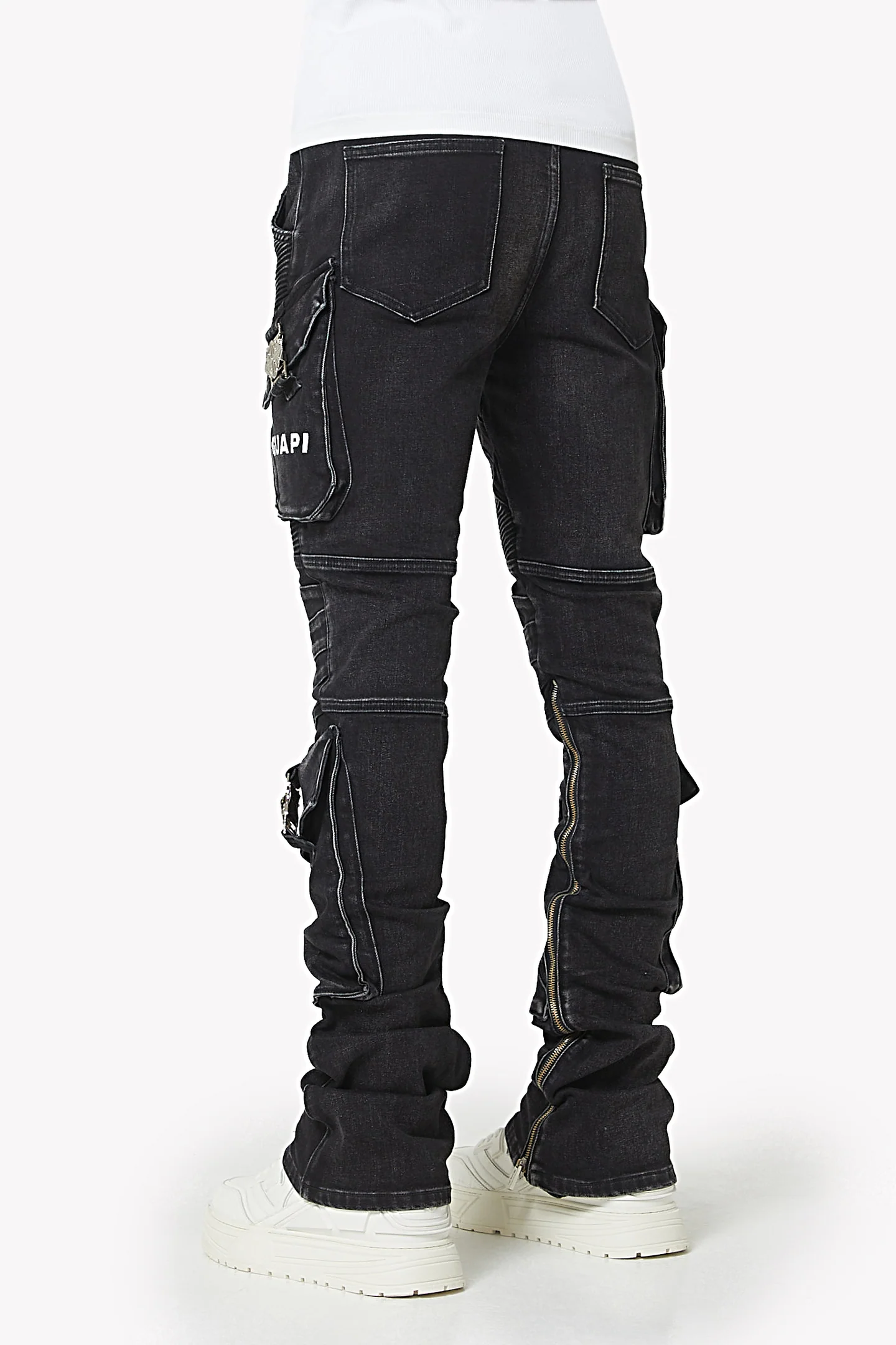 A bold upgrade to classic biker denim, the Vintage Black Oblivion Biker Denim blends GUAPI’s signature stacked silhouette with heavy moto-inspired detailing. The washed-black finish gives the jeans a lived-in edge, while the intricate ribbed panels and multi-layer seam work add depth, structure, and attitude. Each leg is built with functional cargo pockets and secured with custom silver hardware featuring the GUAPI emblem, giving the piece a premium tactical feel. Zipper openings along the inner leg allow you to control the flare and stacking, letting the denim sit clean over any sneaker or boot.