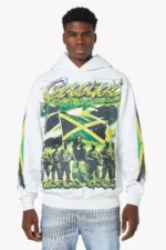 The White World Boss Hoodie stands out as a bold expression of culture, identity, and rebellion, combining vivid graphics with premium streetwear construction. Designed in a crisp white base, this hoodie highlights the Jamaican flag, militant inspired figures, and layered distressed effects that fuse heritage with contemporary edge. The vibrant green and yellow tones clash against the clean background, making this piece a striking statement in the World Boss capsule.